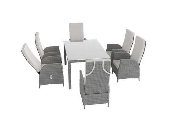 Todo es perfecto con este grupo de mesas de la colección Classics. Los marcos son de aluminio resistente, mientras que el exterior presenta un tejido decorativo de ratán gris moteado. Los cojines de color claro que cubren tanto el asiento como el respaldo ajustable también hacen juego. No te pierdas este lujo y enriquece tu zona de exterior con este cómodo grupo de mesas para una gran compañía. ARTELIA también ofrece el juego de mesa de comedor Ceres Relax en las tallas S, M, L y XL.