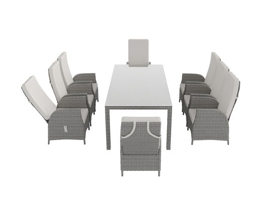 El exquisito juego de mesa Ceres Relax XL de la colección Classics ofrece mucho espacio para un grupo especialmente grande. Consta de una mesa rectangular con un elegante tablero de cristal y un total de 10 sillas, cada una de ellas con un respaldo ajustable. Con la ayuda de un pestillo en el lateral del reposabrazos, puede ajustar individualmente la inclinación a sus necesidades personales, un lujo que seguro que gustará a sus invitados.