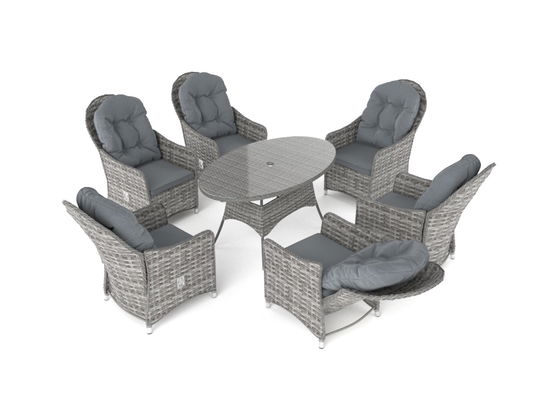 Una mesa redonda, una combinación elegante de seis sillas con respaldos ajustables, más conocidas como sillones: Esta es la mejor manera de hablar entre vosotros mientras coméis la tarta o disfrutáis de la comida con los dedos.