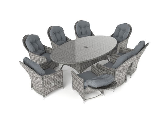 Una mesa redonda, una combinación elegante de ocho sillas con respaldos ajustables que son más bien sillones: Esta es la mejor manera de mantener una conversación entre amigos o familiares mientras disfrutas de una buena comida.