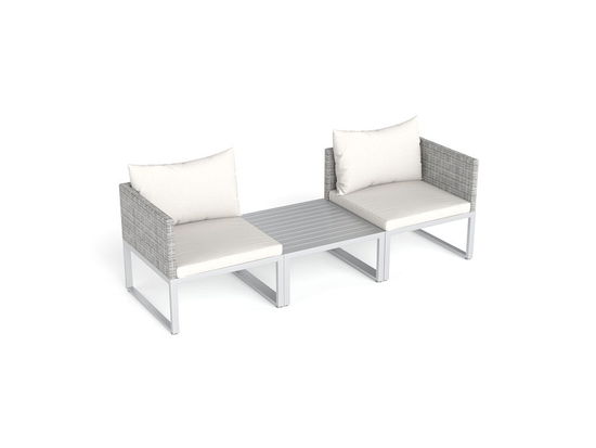 Los marcos del sofá de 3 piezas son de aluminio. El respaldo y los reposabrazos tienen un tejido de poliratán moteado. Los cojines de color claro de los asientos garantizan la comodidad. Si el sofá del salón se utiliza como tumbona, la mesa también puede cubrirse con un cojín y convertirse así en una superficie central de descanso. El bonito conjunto de la colección City es un artista del cambio rápido con un encanto especial.